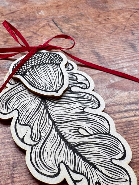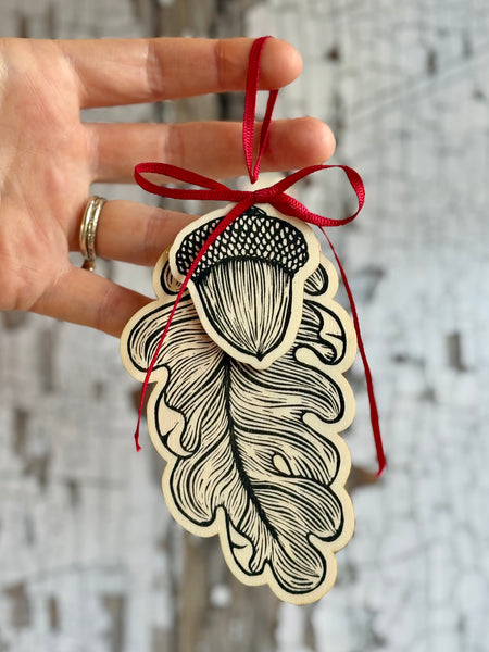 This two part handprinted wooden decoration, features a twisted autumnal oak leaf and acorn. Handprinted from my hand carded Lino blocks onto laser cut plywood and finished with a red ribbon.