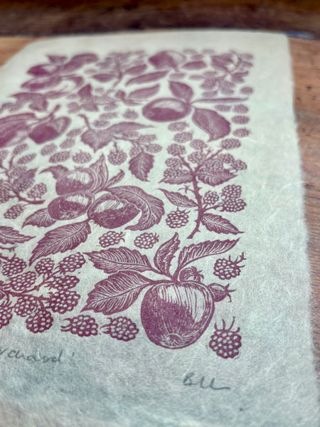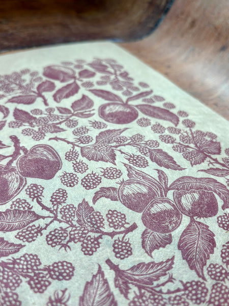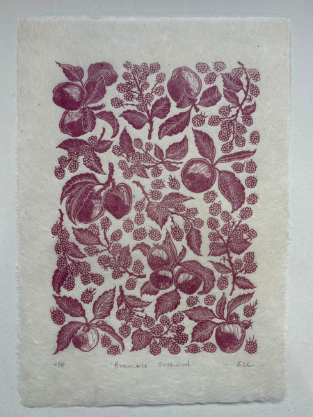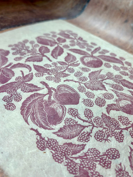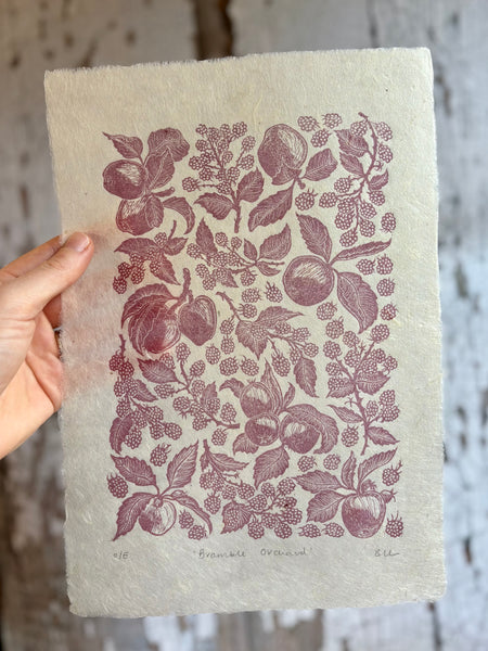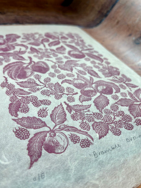 Handprinted by me from my handcarved linocut block. Capturing a bushel of apples and tangle of blackberries found in our orchard in North Cornwall. a multi generation orchard, when we started managing the orchard, the trees were hugely overgrown and struggling, and whilst we spent several years pruning them back to health, the sneaky brambles snuck in, and before long overtook the trees themselves. Now back in harmony, this print was created to celebrate a nearly decade long battle to restore health to our little orchard.