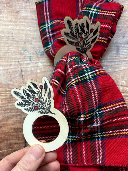 Adorn your napkins with these beautiful napkin rings, featuring a festive sprig of botanicals and red berries.