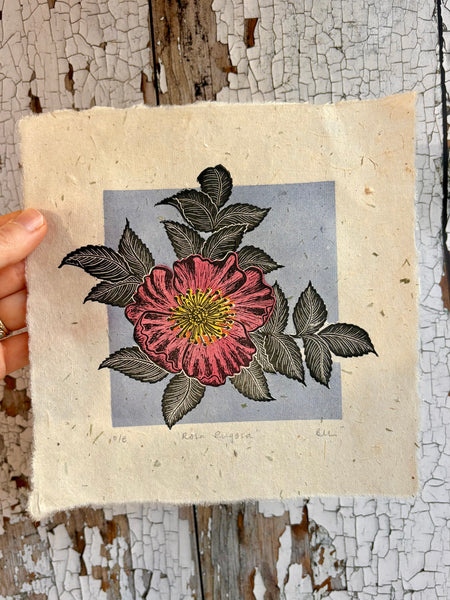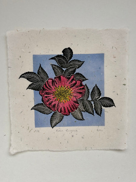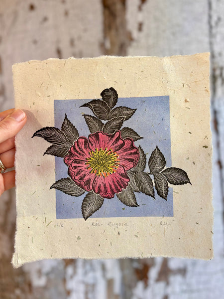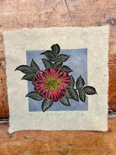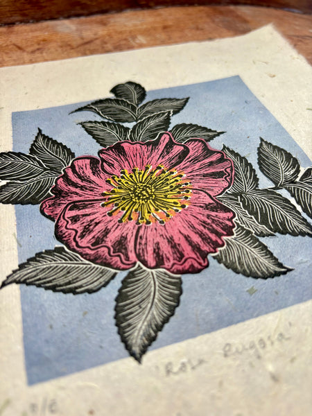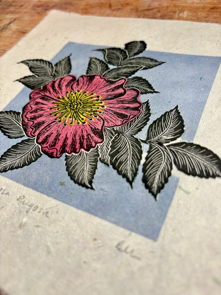 Handprinted by me from 4 handcarved lino blocks, featuring my little boys favourite rose, his ‘Ozzie rose’ which we walk past everyday on the way to nursery. Full of deep magenta colour, loud open petals and bright yellow centres, almost always swarming with bees and surrounded by delicate sets of leaves, and in the winter, enormous rose hips. It is a firm favourite in our home, so I made an everlasting verion for him and us all to enjoy.