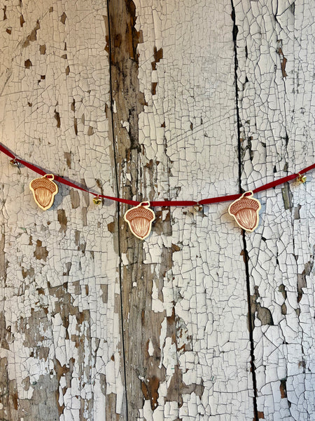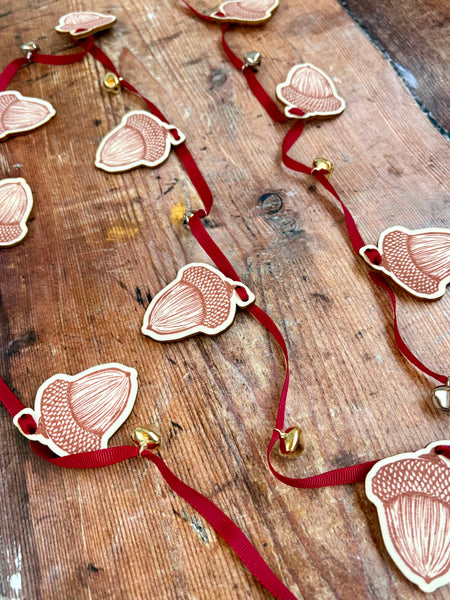 Bring a little nature inside this festive season with this adorable and classy acorn garland. Measuring 2m in length and adorned with 10 handprinted wooden acorns and 12 gold and silver jingle bells on a beautiful deep red ribbon.