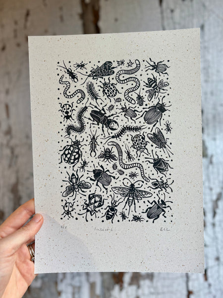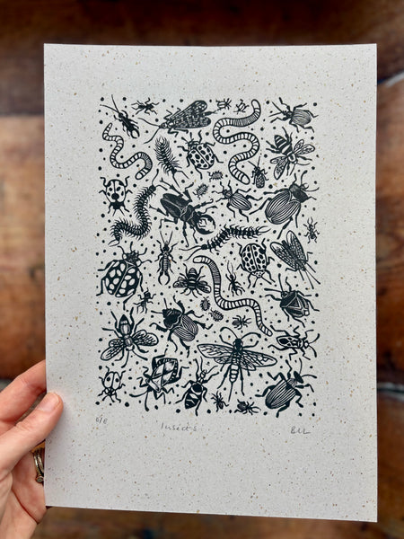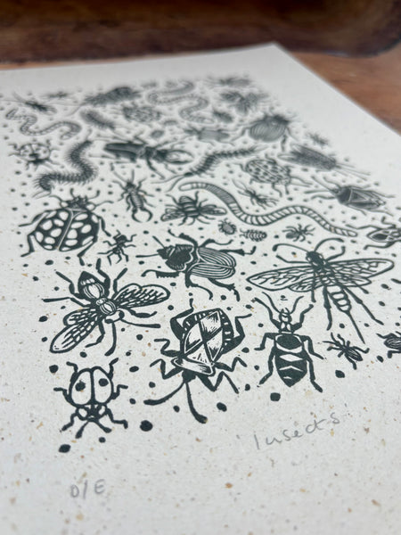 Handprinted by me from my handcarved linocut block. Capturing a vast array of creepy crawlies, wiggly worms, centipedes, beetles, ants, woodlice lady birds and so many more. Inspired by my sons love of worms and beetles, this handprinted original is perfect for any budding entomologist, big or small!