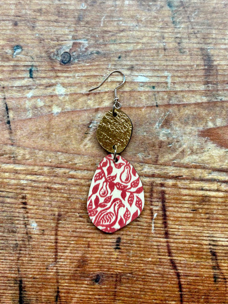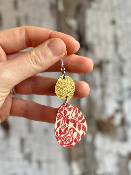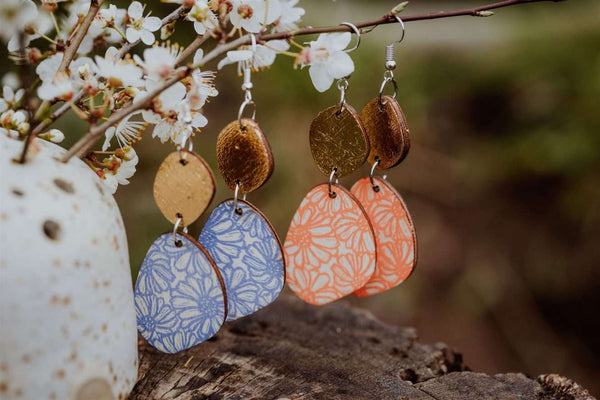 These lightweight wooden earrings are all handprinted from my handcarved lino blocks in a variety of designs and colours and lots of gorgeous gold and silver, to add a little sparkle to any occasion.