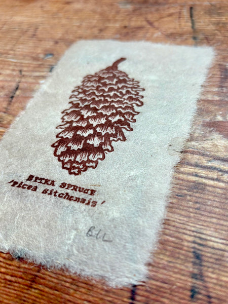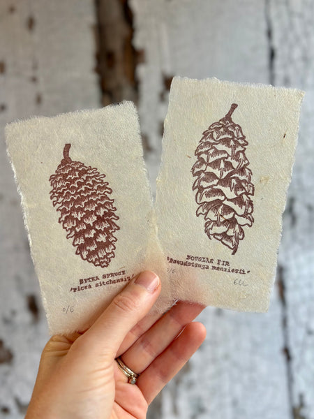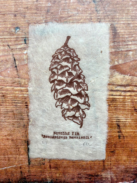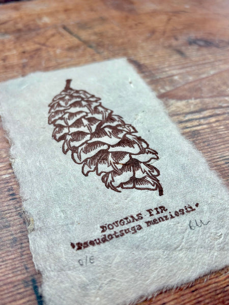 Handprinted by me from 2 handcarved linocut blocks. Featuring a Douglas Fir pine cone and its common and latin name. Perfect for any plant lover, woodworker or woodland fan. Printed on delicate 30gsm handmade Nepalese mountain tissue paper. Made with Lotka bark fibre, a sustainable and renewable resource grown in the Himalayan foothills, creating valuable employment for those living in these areas. Due to the nature of handprinting, each of my prints is unique and distinct and minor variations may occur.