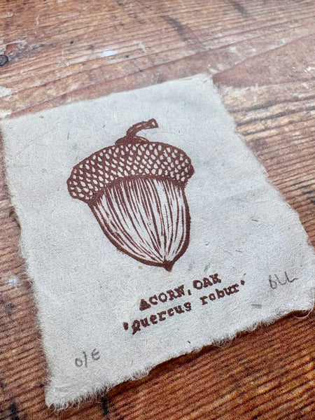 Handprinted by me from 2 handcarved linocut blocks. Featuring an Oak Acorn and its common and latin name. Perfect for any plant lover, woodworker or woodland fan. Printed on delicate 30gsm handmade Nepalese mountain tissue paper. Made with Lotka bark fibre, a sustainable and renewable resource grown in the Himalayan foothills, creating valuable employment for those living in these areas. Due to the nature of Handprinting, each of my prints is unique and distinct and minor variations may occur.