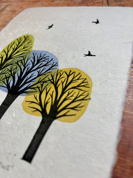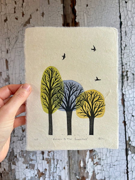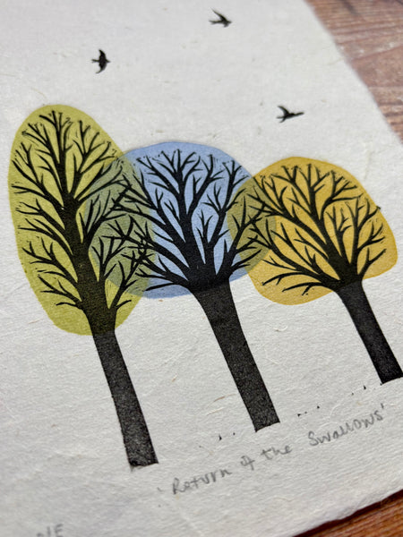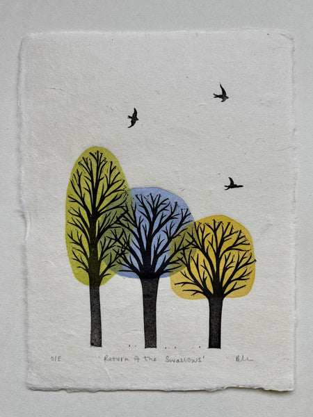 This handprinted original features 3 swallows flying over bare-branched trees surrounded by a halo of colour, emulating that promise of full summer leaves that swallows bring with them on their return from warmer climates.