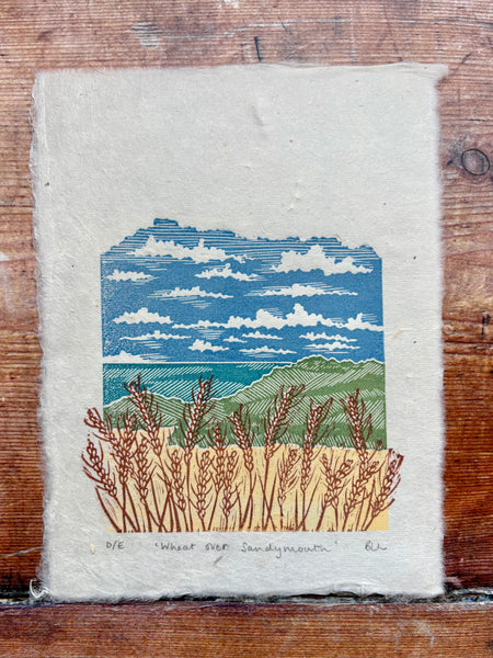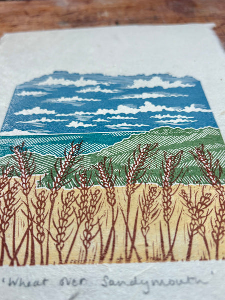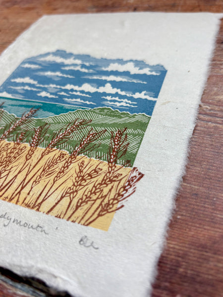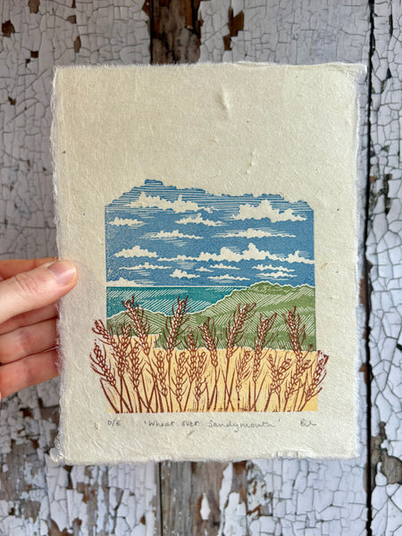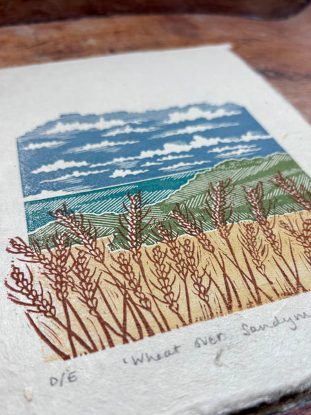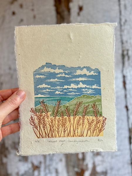 Handprinted by me from 5 handcarved jigsaw linocut blocks. Capturing one of my favourite views from my mid run break spot where I take in the sea and cliffs and over the weeks watch the crops grow and mature. Sometimes sunny, mostly raining, whatever the weather this spot always takes my breath away as I try and catch it again before turning back home.